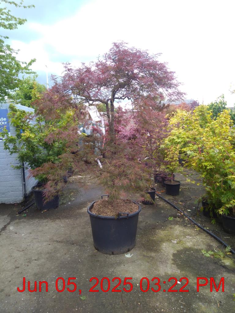 Purple Flowers Apr H2m S3m. RHS Merit. Red Fruit. Graceful Cascading Habit. Rich Brown-Red Dissected Foliage. Autumn Colour-Scarlet. Slight pH Acidic. Pots/Containers. Small Sites. Specimen. Slow Growing. Wind Shelter. Moist Well Drained Sites. Deciduous. Sun-Semi Shade.