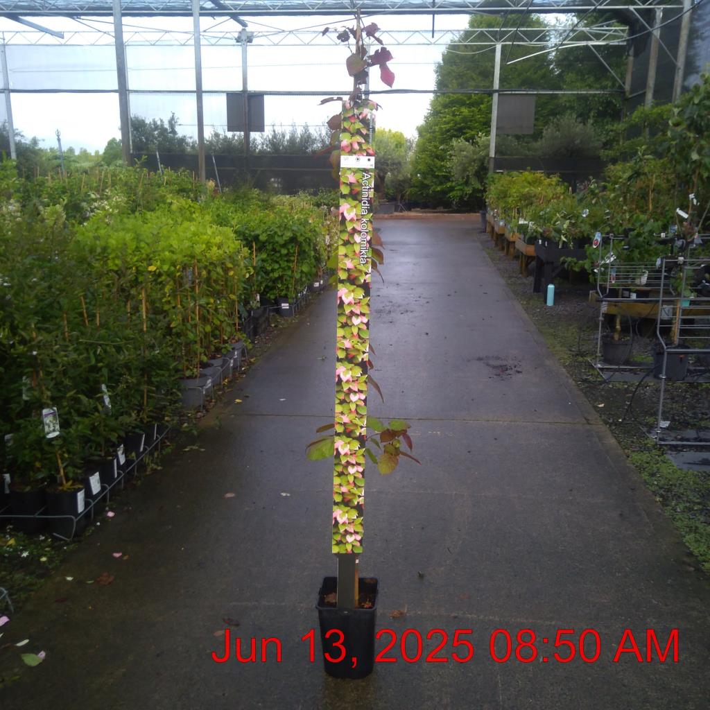 Variegated Kiwi Vine. White Flowers Jun. H5m S4m. RHS Merit. Scent. Attractive Pink/White Tip Foliage. Climbing Habit. Wind Shelter. Moist Well Drained Sites. Deciduous. Sun-Semi Shade.