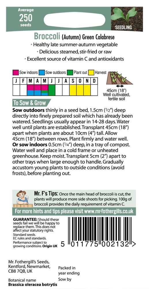 250 Delicious Stems. Late Crop. Sow: Mar-May. Harvest: Aug-Nov. Cooked/Raw. Vit C & Antioxidants.