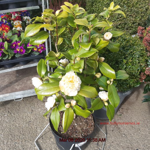 Creamy-Yellow Double Flowers Feb. H4m S2.5m. Spring Centrepiece. Evergreen. Acidic. Sun-Semi Shade.