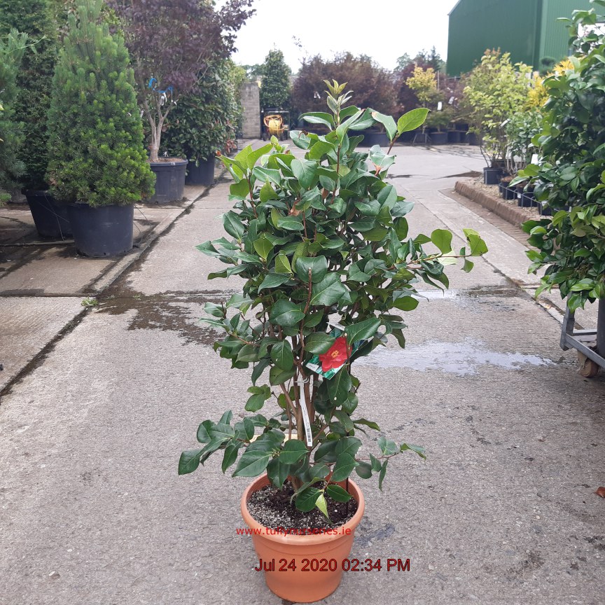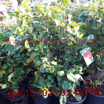 Cherry Red/Lemon Ruffled Flowers Mar-May. H3m S2.5m. Bushy Habit. Evergreen. Acidic. Sun-Semi Shade.