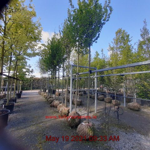 Hornbeam 'Frans Fontaine'. Green Catkin Flowers Apr. H9m S3m. Compact Upright Habit. Gold Autumn Foliage. Street Tree. Wind Tolerant. Deciduous. Well-Drained. Sun-Semi Shade.