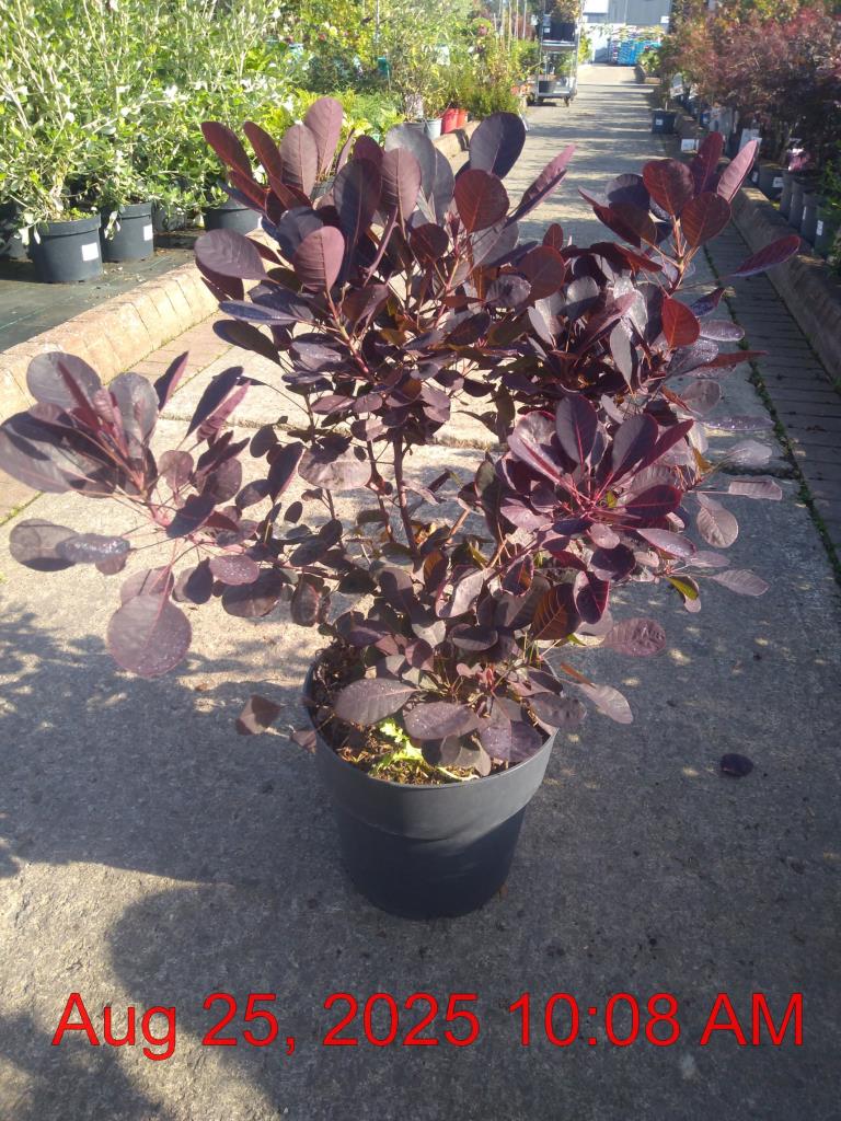 Smoke Tree 'Lila'. Dusty Pink Feather Plume Flowers Jul-Aug. H1.2m S1.2m. Attractive Wine Red-Purple Foliage. Cut Flower. Brilliant Autumn Colour. Slow Growing. Compact Round Habit. Moist Well Drained Sites. Small Sites. Deciduous. Sun-Semi Shade.