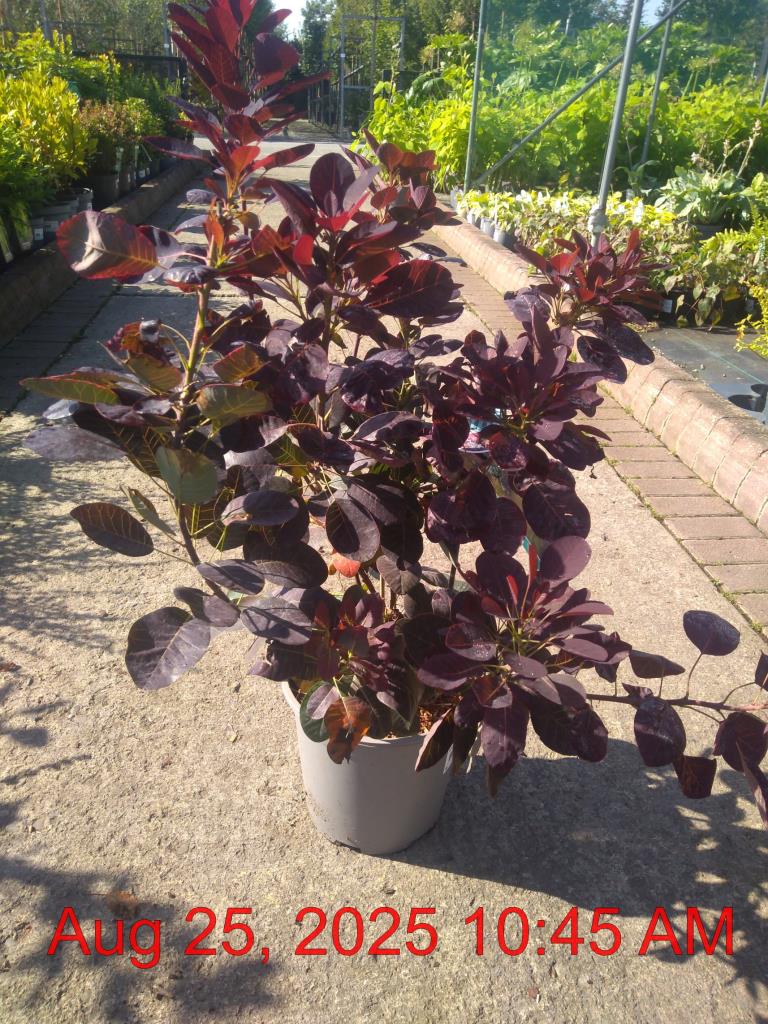 Pink Wispy Flowers Jul-Aug. H4m S4m. RHS Merit. Attractive Round Deep Purple Foliage. Autumn-Burgundy Red/Gold. Round Bushy Habit. Pots/Containers. Small Sites. Wildlife. Cold Tolerant. Moist Well Drained Sites. Deciduous. Sun-Semi Shade.