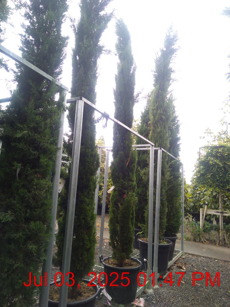 H:15-25m|Flowers:Inconspicuous|Evergreen|Italian cypress, columnar form|Full sun|Hardy:Yes|Bees:Low-provides shelter structure for beneficial insects