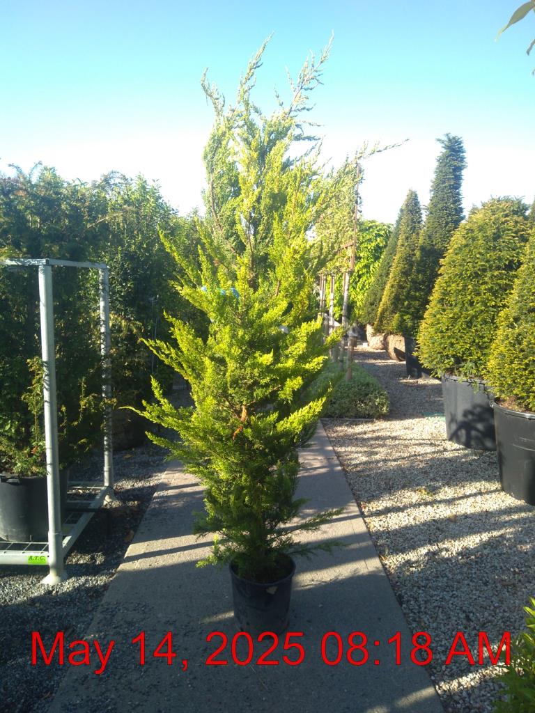 H:8-15m|Flowers:Inconspicuous|Evergreen|Golden conifer, conical form|Full sun|Hardy:Yes|Bees:Low-provides shelter structure for beneficial insects
