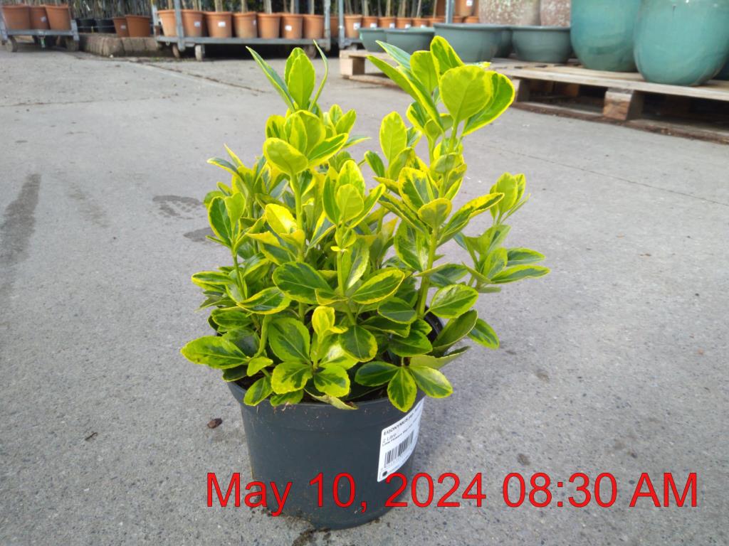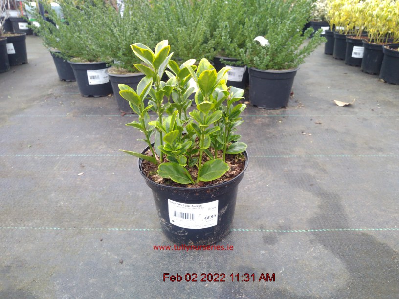 Japanese Spindle 'Aureus'. Lime Flowers May-Jun. H1.5m S1m. Deep Green / Golden-Yellow Foliage. Compact Upright Habit. Pots/Containers. Pollution Tolerant. Urban Sites. Moist Well Drained Sites. Coastal Sites. Evergreen. Sun-Semi Shade.