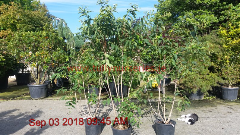 White Flowers Aug-Nov. H6m S3m. RHS Merit. Scent. Plum Hue. Peeling Bark. Deciduous. Sun-Semi Shade.