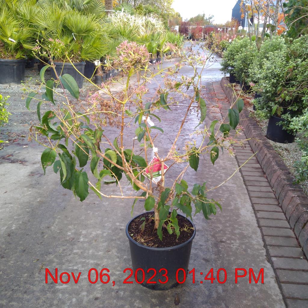 White Cluster Flowers Aug-Nov. H2.4m S1.8m. Scent. Autumn - Red Bracts. Light Tan Peeling Bark. Tall Elegant Habit. Wildlife. Lengthy Bloom. Late Colour. Drought Tolerant. Deciduous. Sun-Semi Shade.