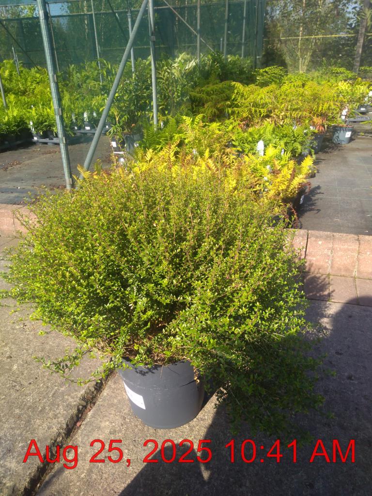 Rich Cream Flowers Apr-May. H1m S2.5m. Vivid Purple Fruit. Box-Like Form. Evergreen. Sun-Semi Shade.