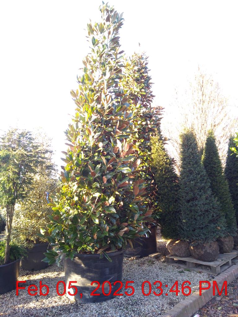 Evergreen Magnolia. Creamy White Cup Flowers Aug-Sept. H15m S15m. Rich Scent. Late Colour. Attractive Glossy Green-Copper Underside Foliage. Rounded Conical Habit. Slow Growing. Cold Shelter. Moist Well Drained Sites. Evergreen. Sun-Semi Shade.