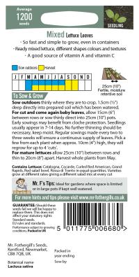 1200/Mixed Leaves. Sow: Mar-Aug. Harvest: Apr-Oct. Fast/Easy Crop. Variable Shapes/Colours/Textures.