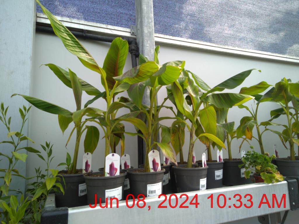 Darjeeling Banana 'Red Tiger'. Long Lasting Yellow Bronze Flowers Jul. H4m S2m. Yellow Fruit. Exotic Large Red/Maroon Stripe Foliage. Fast Growing. Cold Tolerant. Shelter. Winter Protection. Evergreen. Sun-Semi Shade.