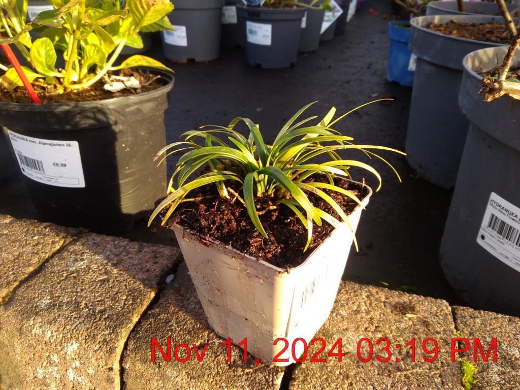 Petite White-Lilac Tinged Flowers Jul-Aug. H0.1m S0.15m. Turquoise Blue Fruit. Elegant Narrow Grass Like Foliage. Low Clump Habit. Pots/Containers. Tree Base. Slow Growing. Drought Tolerant. Shade Tolerant. Groundcover. Moist Well Drained Sites. Evergreen. Sun-Semi Shade.