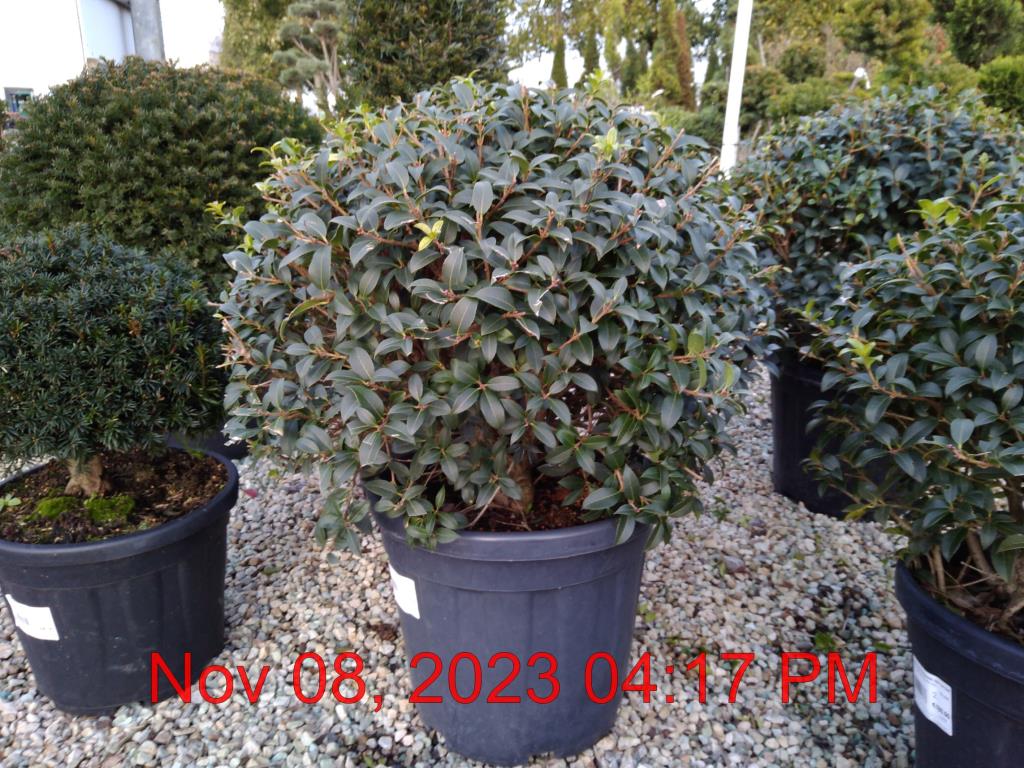 White Flowers Sept-Oct. H4m S4m. RHS Merit. Scent. Fruit. Dense Habit. Evergreen. Sun-Semi Shade.