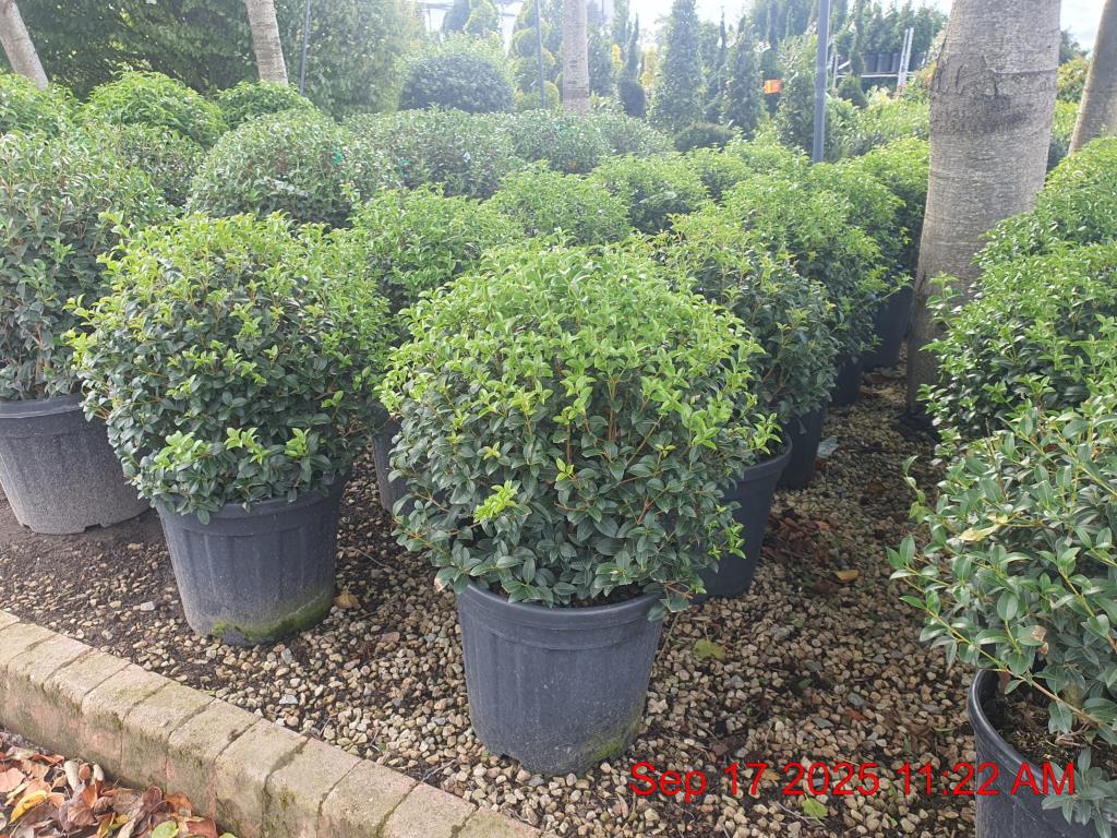 White Flowers Sept-Oct. H4m S4m. RHS Merit. Scent. Fruit. Dense Habit. Evergreen. Sun-Semi Shade.