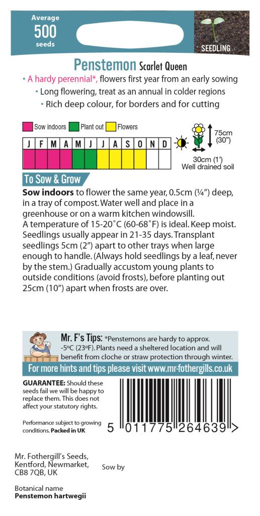 500/Rich-Deep Red Flowers. H0.75m S0.3m. Sow: Jan-Apr. Flowers: Jul-Oct. Long Bloom. Hardy Perennial.
