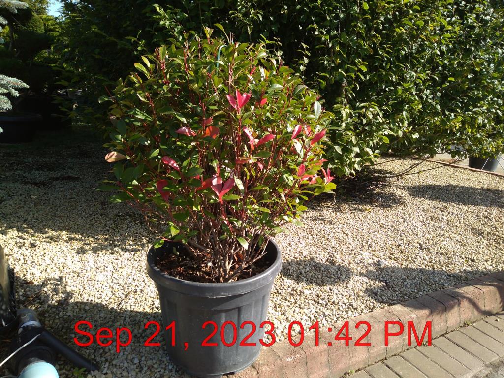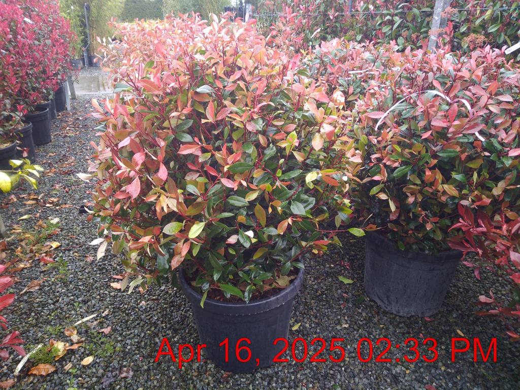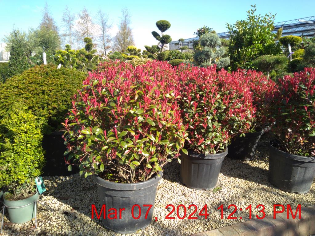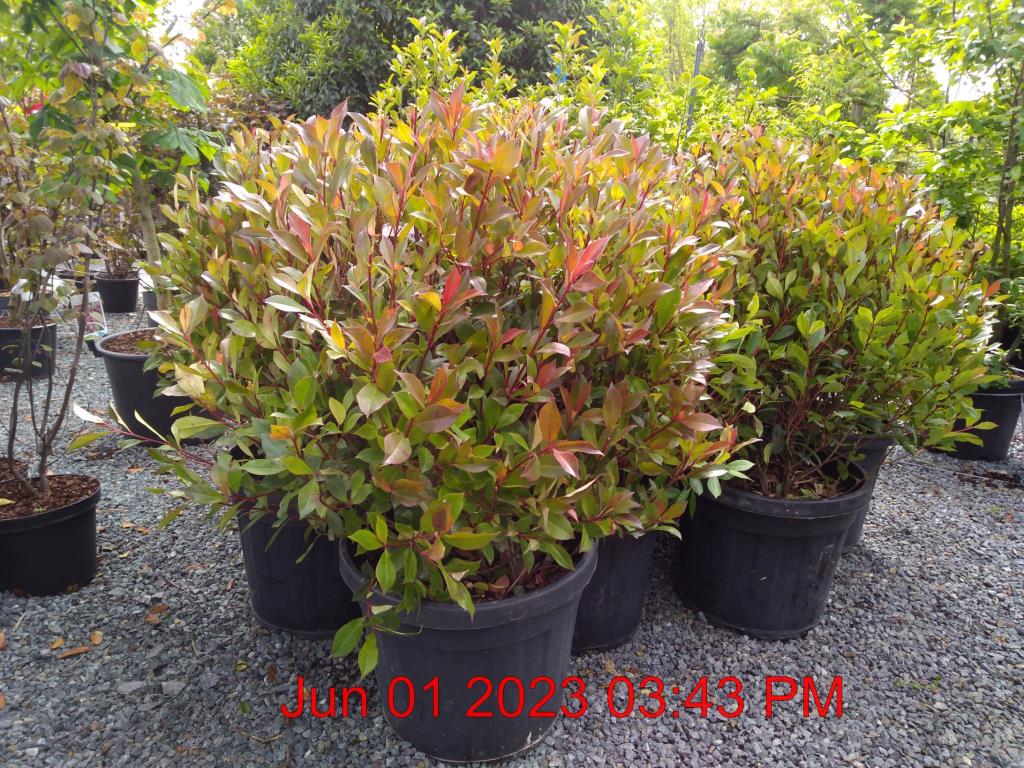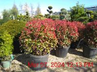 Christmas Berry 'Carre Rouge'. Creamy White Panicle Flowers May-Jun. H2.5m S2m. Attractive Bright Scarlet / Green Foliage. Fruit. Specimen Umbrella Habit. Drought Tolerant. Evergreen. Sun-Semi Shade.