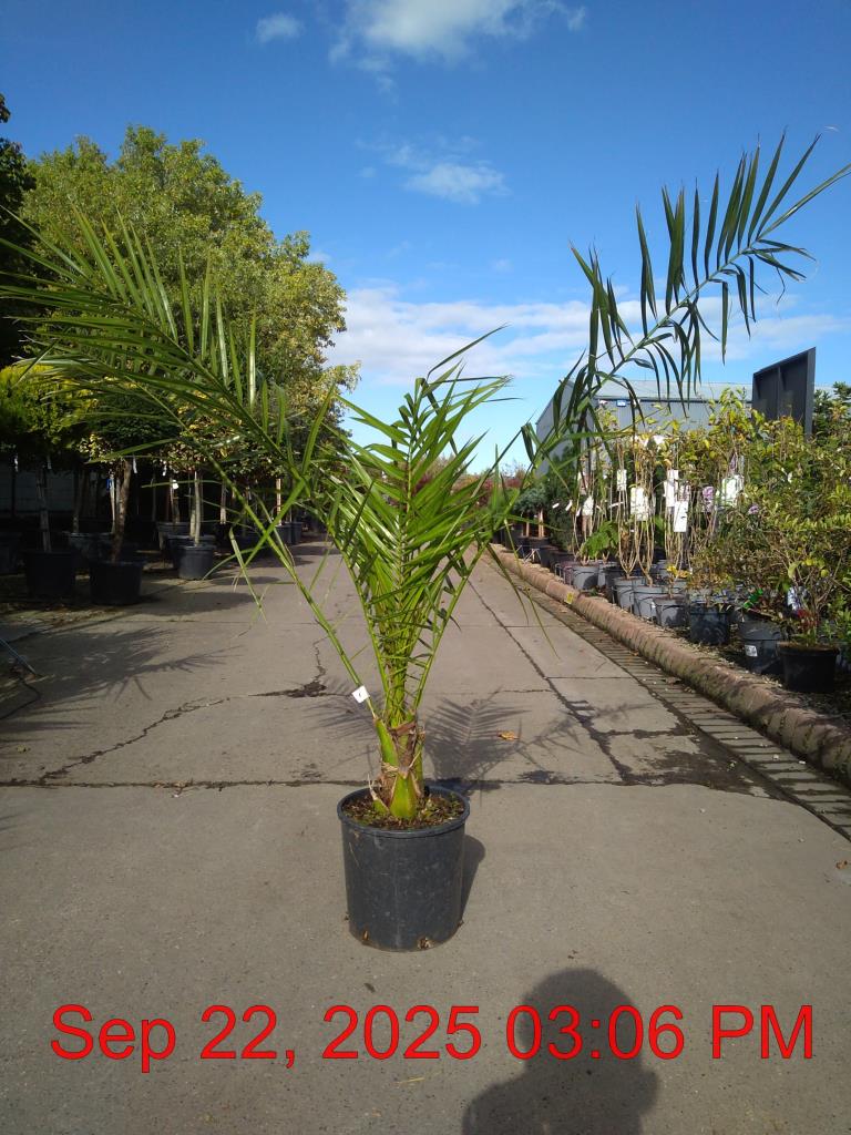 Canary Island Date Palm. Creamy Yellow Flowers Jul-Aug. H20m S8m. RHS Merit. Fruit. Elegant Tropical Specimen. Evergreen. Shelter. Sun-Semi Shade.