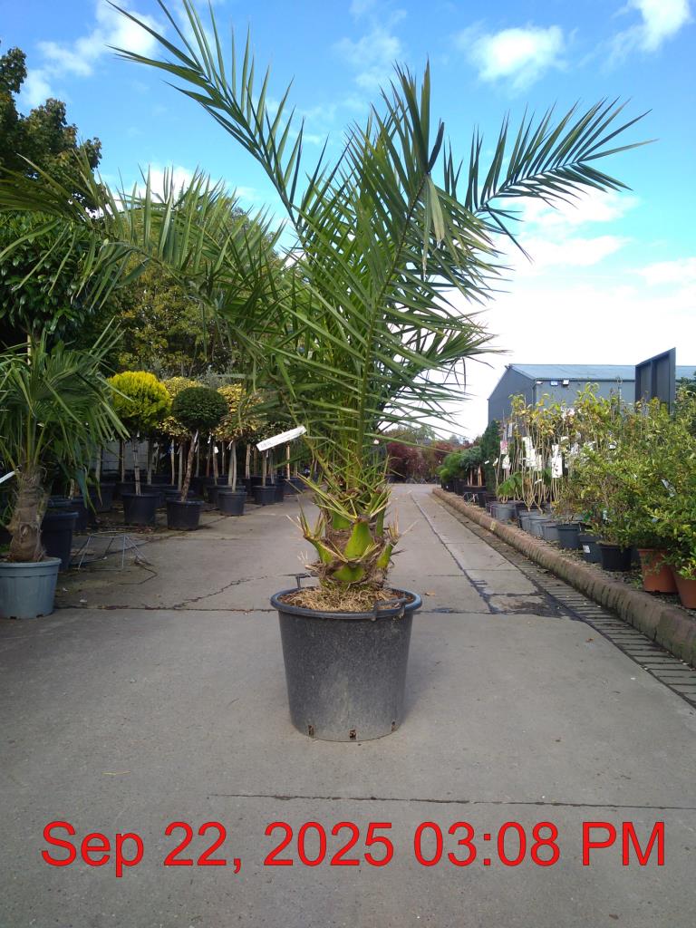 Canary Island Date Palm. Creamy Yellow Flowers Jul-Aug. H20m S8m. RHS Merit. Fruit. Elegant Tropical Specimen. Evergreen. Shelter. Sun-Semi Shade.