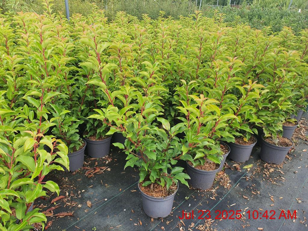 Portuguese Laurel. White Flowers Jun. H6m S5m. RHS Merit. Scent. Fruit. Red Hue. Neat Habit. Evergreen. Sun-Semi Shade. Ideal Hedging.