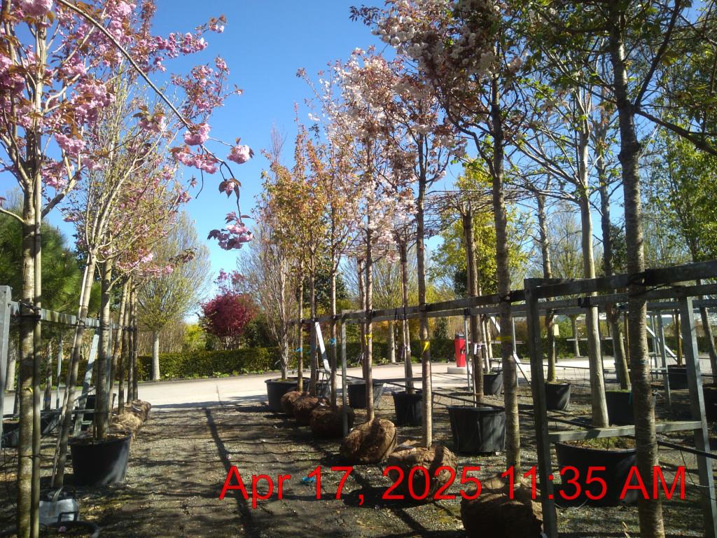 Cherry Blossom 'Fugenzo' Rose-White Double Flowers May. H10m S8m. RHS Merit. Autumn - Fiery Red /Orange Hue. Broad Vase Habit. Cold Tolerant. Deciduous. Sun-Semi Shade.