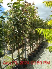 Japanese Cherry Blossom 'Kanzan'. Lilac Double Flowers Apr. H10m S8m. RHS Merit. Young Chestnut Foliage. Autumn Yellow-Orange. Broad Vase-Spreading Habit. Cold Tolerant. Avenues / Urban Sites. Deciduous. Sun-Semi Shade.