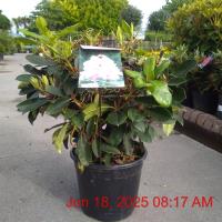 Large Soft Pink Flowers May. H1.4m S1.6m. Scent. Pale Green Foliage. Acidic. Evergreen. Sun-Semi Shade.