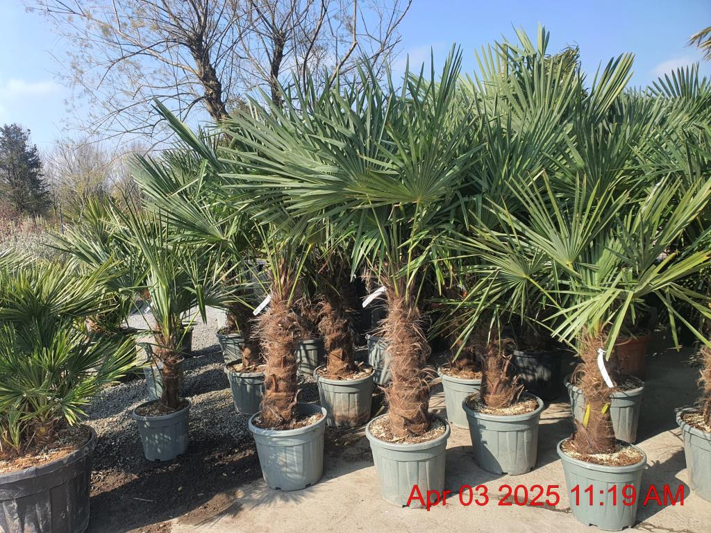 Chusan Palm. Light Yellow Flowers Jun.H12m S2.5m. RHS Merit. Fan Foliage. Cold Tolerant. Coastal Tolerant. Slow Growing. Evergreen. Shelter. Sun-Semi Shade.